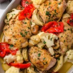 A hearty one-pan dish featuring succulent chicken, cauliflower, and artichokes, simmered in a savory broth with white wine.